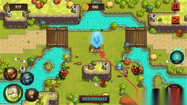 3、在战斗关卡界面,玩家可布置防御塔并指挥英雄作战,全力守护中央核心(蓝色水晶)。在此过程中,需凭借策略性的防御布局来抵御敌人,充分展现塔防玩法的独特魅力。