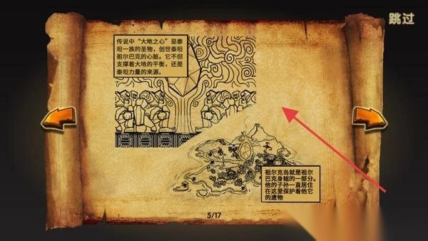 1. 在游戏剧情卷轴界面,会呈现“大树之力”“图尔巴巴”等相关背景故事。通过点击箭头能够实现翻页操作,进而深入了解游戏的世界观设定。