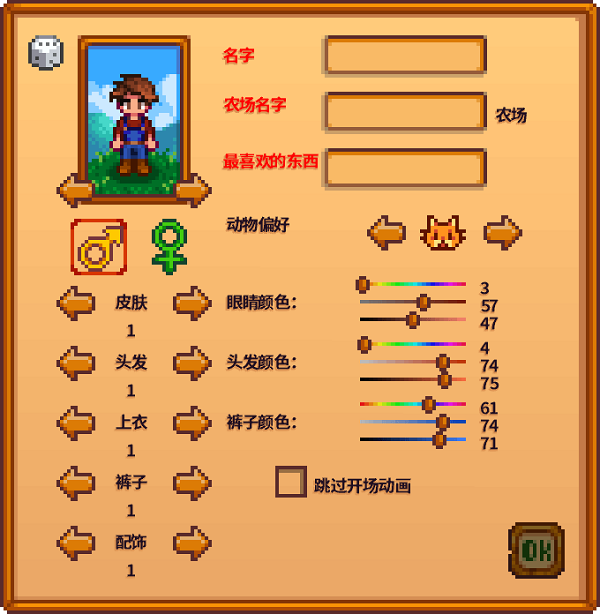 在角色创建界面,玩家能够自主挑选角色名字、外貌、性别、喜好、农场名字以及宠物偏好。