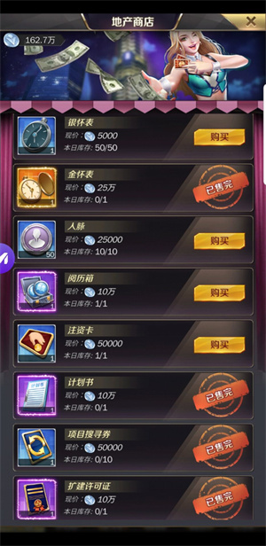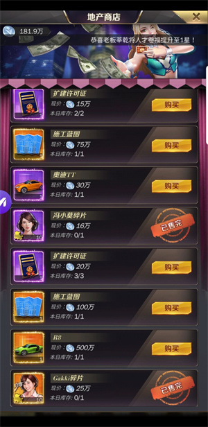 我所购买的仅作参考哈。除了上面提到的三件物品外,我强烈建议一定要买10w地产币的扩建卡,要知道越往后玩,扩建卡就越发短缺。还有50w的住宅蓝图,虽说价格有点高,但也推荐购买,不过这方面大家看法可能不同,自行斟酌就好。