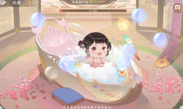 洗澡过程中,屏幕上会冒出许多泡泡,家长们只要戳破蓝色泡泡,就能让宝宝洗得香喷喷的哦~
