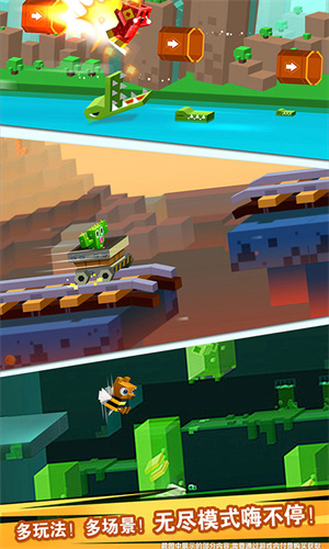 1、游戏画面采用了横版3D的经典冒险模式呈现,整个世界以方块像素风格制作,不管是道路场景还是小动物们,全部都是方块模样,看起来十分的搞怪。游戏画面质量并不差,虽然采用了方块元素制作,但是在场景和人物的细节上都处理的十分细腻,色彩搭配与融合也非常恰当,并不像普通像素游戏那么模糊的质感;