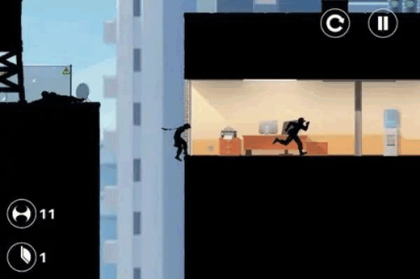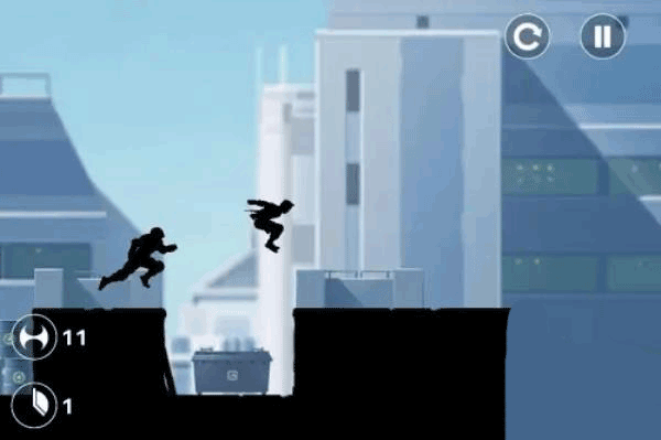 剪影的画风却也是如今各种非主流游戏很喜欢使用的一种画风,本作也不例外,在看似阳光的城市中,两个黑暗的剪影,明媚中却有种肃杀的感觉。而游戏动作设计则相当的帅气,什么后空翻滚,踢腿腾越,障碍攀爬,借力跳跃种种跑酷中的动作在游戏中都将一一展现。游戏在跑酷过程中还会遇到一些打分的地段,只需要完成相应的操作,主人公便会耍出狂拽酷炫的动作。无处不跑酷,无处不耍酷,这便是这款游戏的宗旨