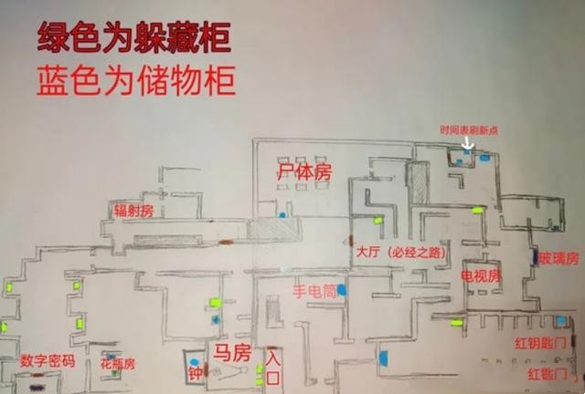 1、记住地图:首先看下下面的地图,其中绿色标记为躲藏柜,蓝色标记为储物柜,其余房间为红字标记;