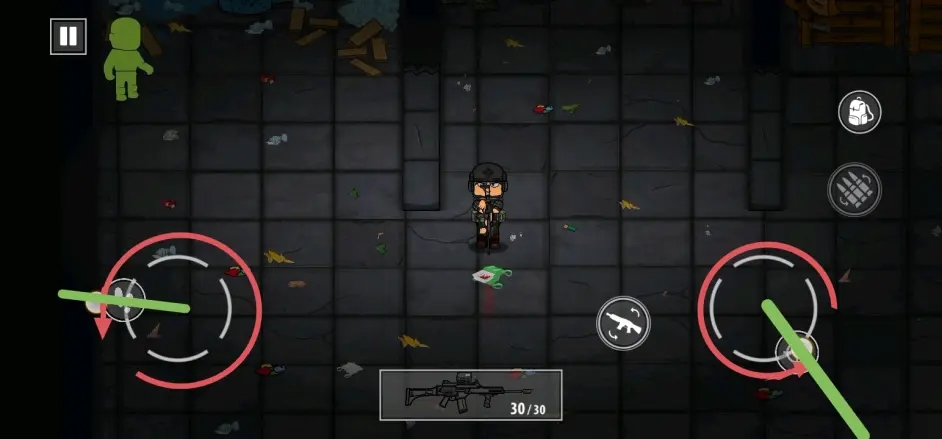 对新萌玩家,首先要了解的就是枪的赖皮对枪法,如下图假设绿色垃圾袋为敌人,要左右摇杆同向转动,同时摇杆的夹角(图中辅助绿线)成九十度到一百二十度左右。此时人物的枪线就会一直对着敌人,而这个游戏默认是有自动开枪的,而大部分玩家没有更改,就会枪跟着转却无法开枪,当然出现这种情况的大多都是人机。该枪法建议使用霰弹枪范围大更好操作。