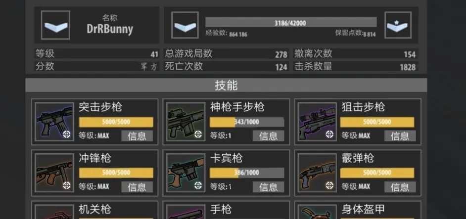 2、让我们来看看大厅里的按钮,在这里你可以看到战士所有统计数据,以及它的技能进展。