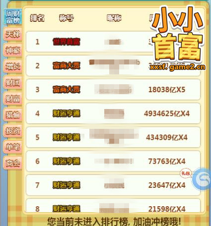 “亿万富翁”“千万富翁”这两个称号可通过在充值排行榜中取得名次而获得。