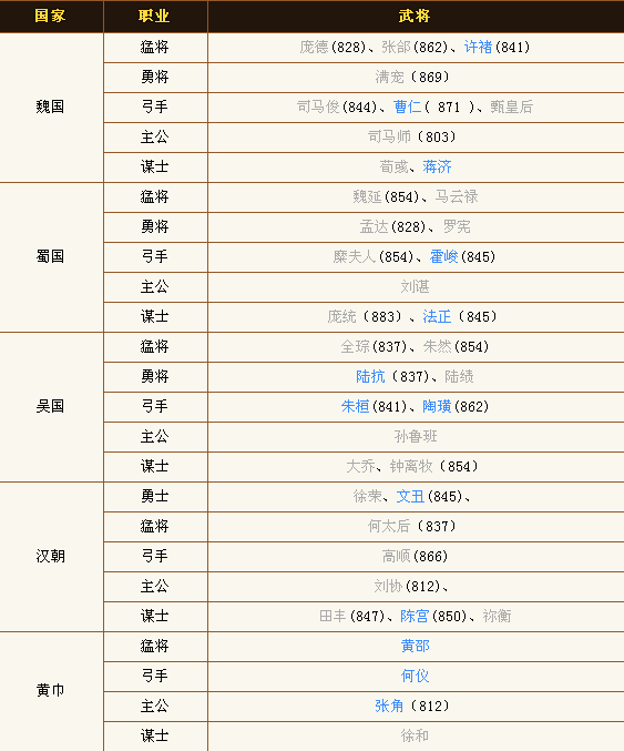 橙将:夏侯惇、夏侯渊、张辽、许褚、典韦、司马懿、曹仁、荀彧