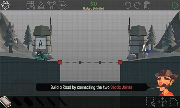 游戏中要注意,搭桥所用的材料,只有从白色的锚点处开始搭或结束,桥才牢固,其他没有白色锚点的区域,不管使用什么修建材料,都是搭不稳的,请注意这点