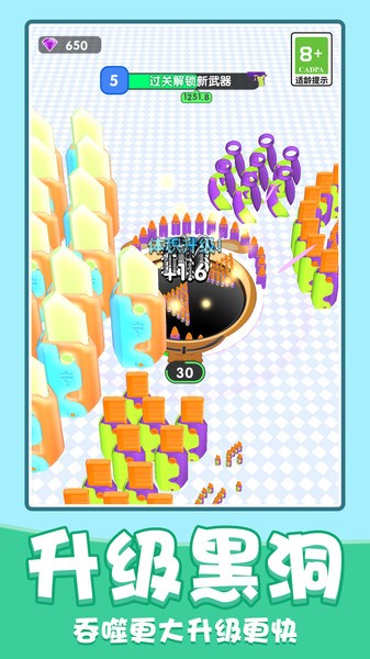 - 借助进化持续升级黑洞,从而挑战难度更高的关卡,感受游戏进化所带来的成就感与满足感。