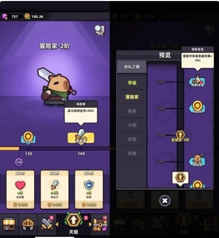 首先解锁的是天赋系统。《Capybara Go!》的天赋系统也进行了优化,共有生命值、攻击力、防御三个升级项。每个阶段可升级次数有限,当三个属性都升到最高级别时,会提升天赋阶段,可以获得额外属性加成。此外,每次升级天赋,都会积累总共升级的次数,达到指定次数还会获得额外的奖励,如金币、时装、buff等。值得一提的是,从预览里可以看到,《Capybara Go!》的天赋系统相当深,后续需要的资源也相当多。