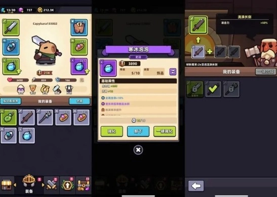 第二个解锁的养成系统是装备系统,整体设计比较常规,玩家可以通过开启宝箱抽取装备,消耗特定材料能对装备进行升级,而三件相同的装备还能合成为品质更高级的装备。装备除了具备基础属性外,高品质的装备还能解锁额外的特效与特殊能力。