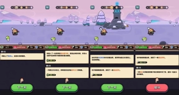 具体来说,这款游戏采用关卡制设计,每个关卡包含数十个天数(也可理解为回合数)。每推进一天,玩家就会遭遇各类随机事件,这些事件有正面也有负面,主要可分为几类:提升或降低角色属性、获得新技能或强化已有技能、通过简单事件获取经验值,或是通过简单战斗事件同时获得经验值与金币。
