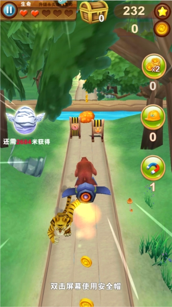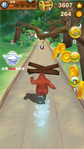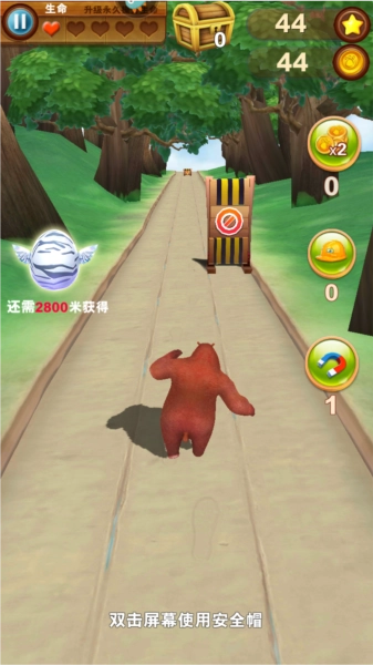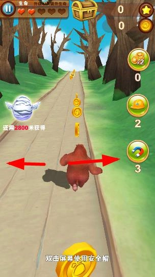 游戏操作简单,跟普通的跑酷游戏差不多,玩家只需向上滑动屏幕,便可控制熊大跑动或者跳跃,越到低障碍时,向下滑动屏幕,便可操控熊大向下滑行躲避障碍。简单的操作,玩法却充满了挑战,一路不断出现的各种障碍,实在让小编头疼,在躲避它们的同时,还要尽可能的吃到沿路的金币,但是金币虽好,可不要贪心哟,学会避重就轻才是跑酷游戏的关键,如果光想着吃金币而忽略了一路的障碍,撞击费血,那就得不偿失了。