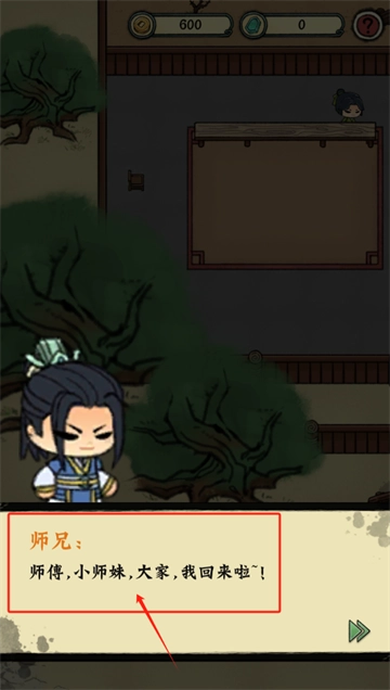 1、点击师兄进行对话并看完剧情后,右上角会显示有600金币可供使用。