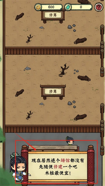 2、点修葺牌子,按提示先建最便宜的木桩训练场。
