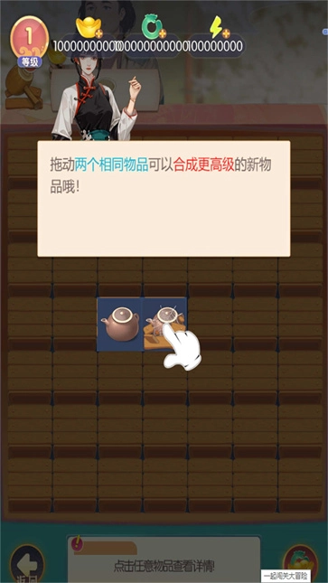 2、融通过拖动两个相同物品合成更高级物品,对客栈进行装修升级。