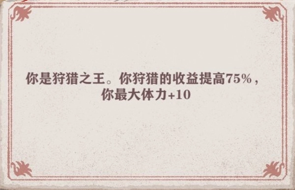 在低光环的情况下,属性不足,打工收益较低。狩猎之王可以在前期快速获得金钱,购买需要的物品。
