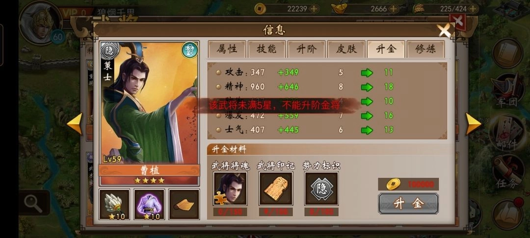 特定武将五星后,消耗指定材料可升金,改变武将形象和大量提升属性成长值。(请留意开放升金的武将)
