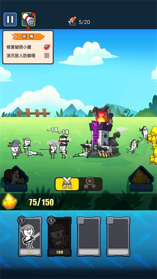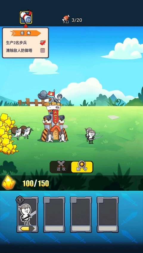 1、在这款游戏里,玩家要操控矿工进行挖矿作业,把开采到的矿物用于招募士兵;之后可以指挥这些士兵开展防守或进攻行动,最终目标是摧毁对方的防御塔以获取胜利,而如果己方的防御塔被摧毁,那么游戏就会失败。