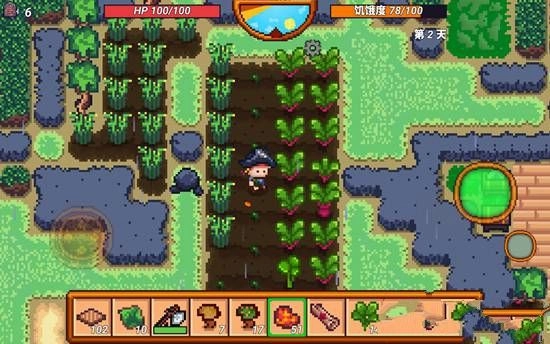 4、种好东西后就等着收获了,游戏中我们要保持自己的饥饿值,经常会去野外到处跑寻找食物,有时候也需要寻找纤维来制作绳子,有了自己的土地,那么这些东西就不用跑那么远去寻找了,自己地里就可以自给自足了。