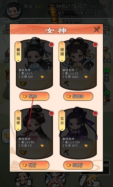 4、元宝收益还能用于解锁和升级女神,升级后的女神可以为愚公挖山时的元宝收益与攻击力提供加成
