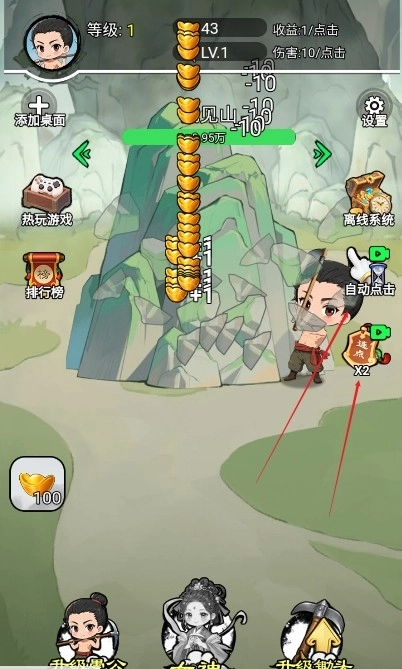 1、点击屏幕即可让愚公开展挖山动作,通过挖山能够获取元宝收益;