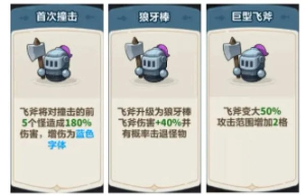 「飞斧」与「三板斧」提供范围伤害与击退效果,有效阻止怪物靠近城墙。
