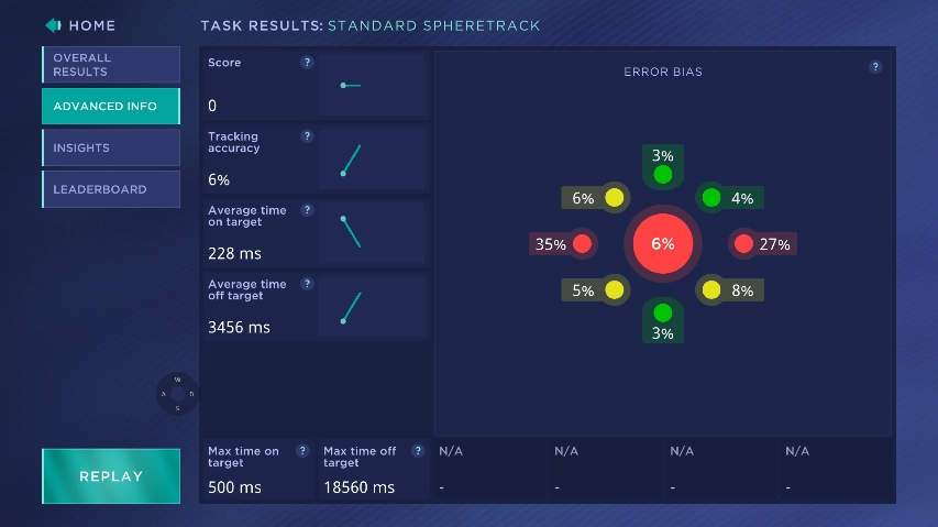 为了成为最强者而刻苦训练,并不代表在这个过程中就无法感受到乐趣。AimLab手机版设置了15种小游戏形式的任务(后续还会新增更多),这些小游戏都会聚焦于冲击排行榜榜首所需的某几项关键技术。通过训练,可以提升速度、命中率、反应时间、反应射击能力、快速反应能力、头部射击精准度等多项指标。