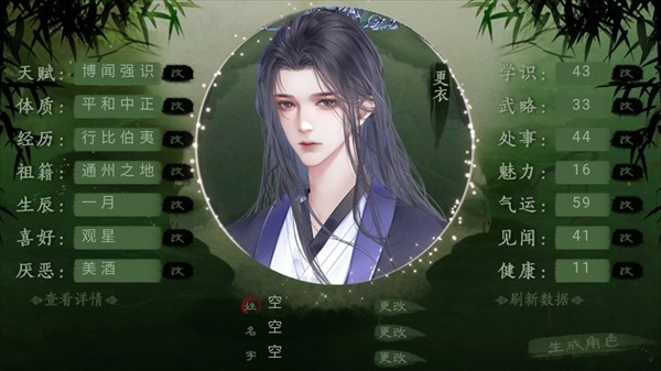 1、打开游戏,能够看到角色相关的一系列信息,包括了天赋、体质、经历、祖籍、生辰、喜好、学时等等,对了别忘记给自己的角色取一个好听的名字。