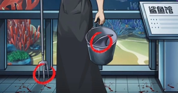 6、接着点击水族馆里的海豚,之后再点击地面上的血迹以及饲养员手中的叉子。