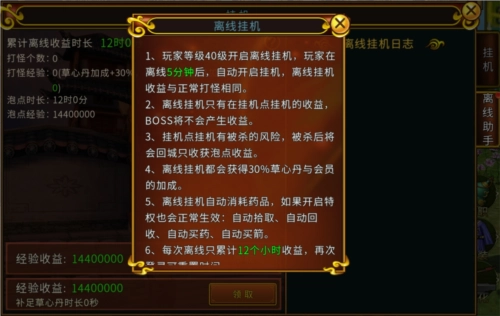 而且在空闲时间,可以选择在野外刷怪来获取打怪经验。达到40级之后正确设置离线挂机,每隔一段时间上线获取收益。