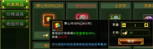二、购买草心丹。使用草心丹可以在24小时内提升30%打怪获得的经验,而且可以与其他的经验道具和经验奖励效果叠加。
