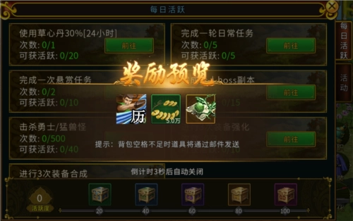 1、每日会开启活跃任务,完成任务获取活跃度可以额外领取活跃礼包