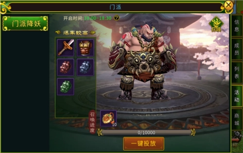在门派里,我们可以体验有趣的活动玩法-门派降妖,和门派成员一起召唤妖兽,共同击杀获取奖励,也可以在使用“门派贡献”在门派商店里购买物美价廉的道具,还可以组织团建活动等......