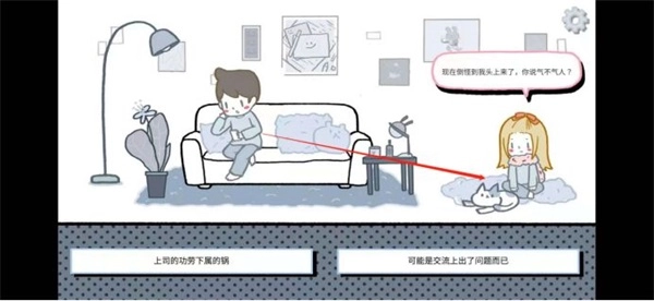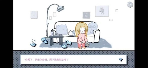 加班到很晚回家遇到满地垃圾,当然是要你自己收拾了,不要点选项!点击地面上的垃圾,她也是非常懂事会自己收拾,然后让你去休息。
