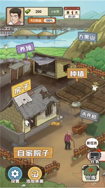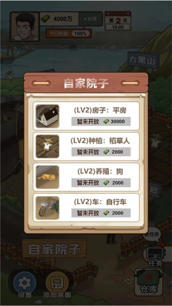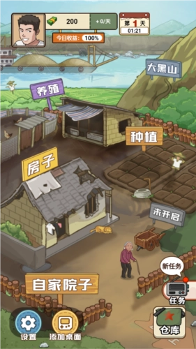 3、进入自家院子界面后,能看到养殖区、房屋、种植地以及大黑山等不同场景,每个场景都对应着各自的任务。