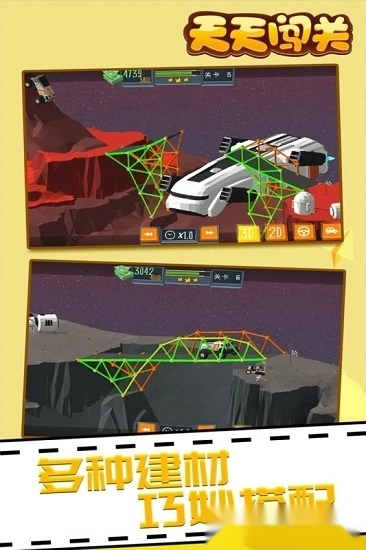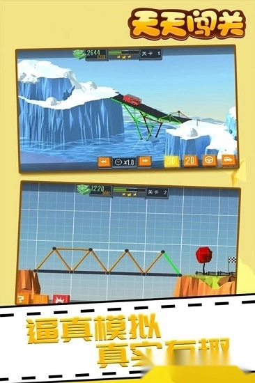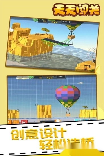 《天天闯关》是一款益智解谜类游戏。在游戏里,你将化身桥梁设计师与建造师,根据不同条件为小汽车、卡车等各类车型设计并建造桥梁,帮助它们顺利通行。现在就开启你的脑力风暴,动手建造吧!