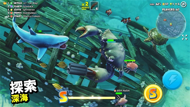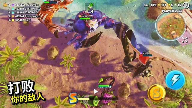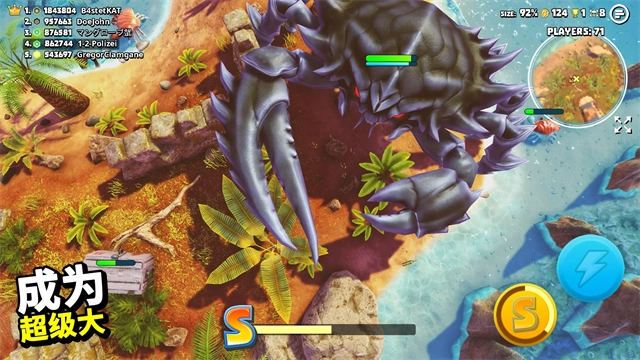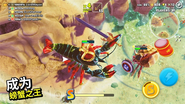 2、趣味十足的战斗玩法,操控你的螃蟹与其他玩家展开激烈对决,搜寻强力武器,尽情享受战斗带来的乐趣;