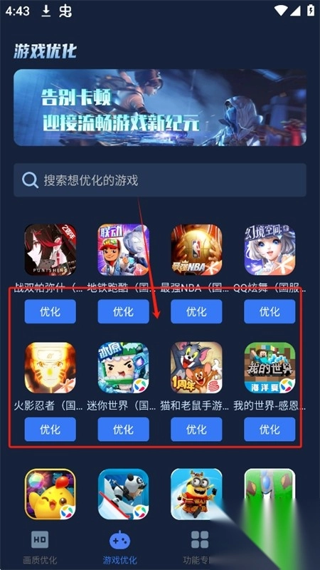 6、在游戏优化页面,可直接选择游戏进行优化,提升画面效果。
