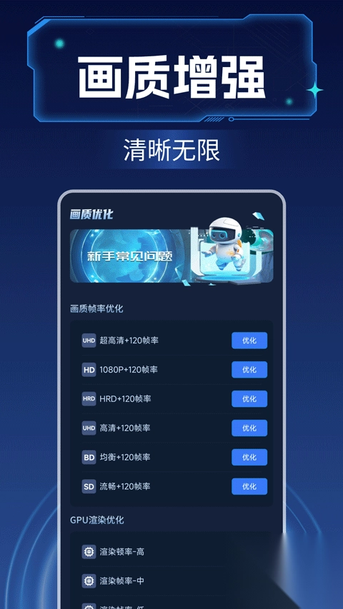 画质增强大师 2025 最新版本,堪称一款实力强劲的专业级手机画质优化利器。它运用核心唤醒技术,能够智能地对 CPU 频率与 GPU 性能分配进行调整,达成高帧率输出,令动态画面呈现出更为流畅自然的视觉效果。 不仅如此,画质增强大师还具备光线追踪渲染技术,通过优化纹理加载策略,充分挖掘硬件潜力,保障画质愈发清晰生动。并且,借助智能算法全方位提升显示效果,支持图像修复、游戏渲染、流畅度优化等多种场景增强,甚至还配备准星辅助等实用功能。如此一来,用户能够轻松收获更清晰、流畅的视觉体验。不管是日常使用,还是投身游戏娱乐,只需一键操作,就能释放设备的显示潜能,营造出沉浸式的观感享受。