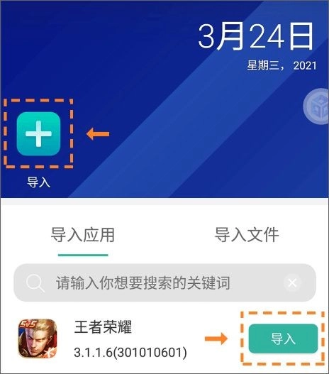 1、打开虚拟空间,点击桌面的导入按钮,将王者荣耀添加到虚拟空间内。