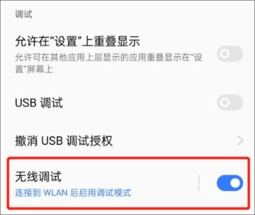 3、在手机设置中找到并点击“开发者选项”,进入该页面后,开启“无线调试”功能,随即进入无线调试页面。