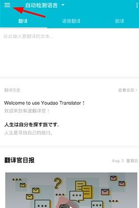 1若用户想要在有道翻译官中进行离线翻译,需点击页面左上角的横杠按钮,打开个人功能列表后再进行操作。