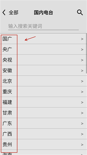 4、进入国内电台界面,可看到包括国广、央广、安徽、北京、重庆、福建等各大国内的电台频道,