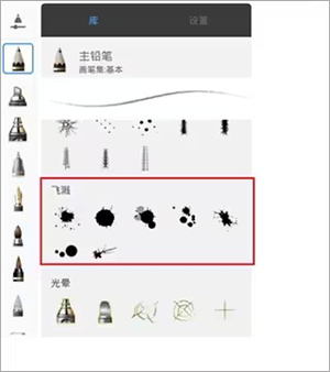2、然后往下翻,可以看到飞溅的效果。这个类型的笔刷就非常适合用来做血迹的效果;