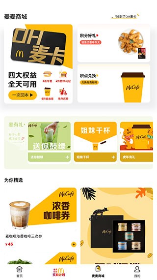 3、而在【麦麦商城】页面,我们还能开通麦卡特权,或者使用上述的消费积分兑换超值好礼。