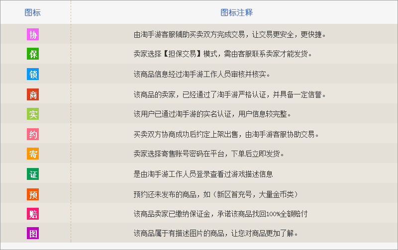 亲~以下是“淘手游”平台中常见的图标解释,大家可以先了解图标对应的解释,方便您在平台操作使用时明白其表达的意思哦: