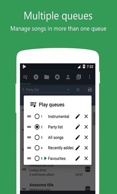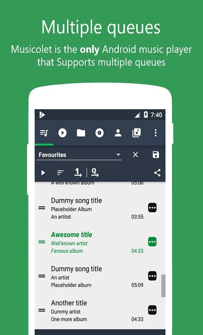现在,它可以创建/管理一个队列,同时从另一个队列听歌。Musicolet是安卓市场上唯一支持多个队列的音乐播放器。您最多可以创建20个队列。