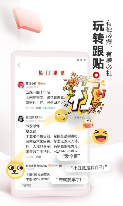 热门跟贴火前围观,精彩盖楼前排占座,看各路豪杰神贴纷飞,与吃瓜群众插科打诨!